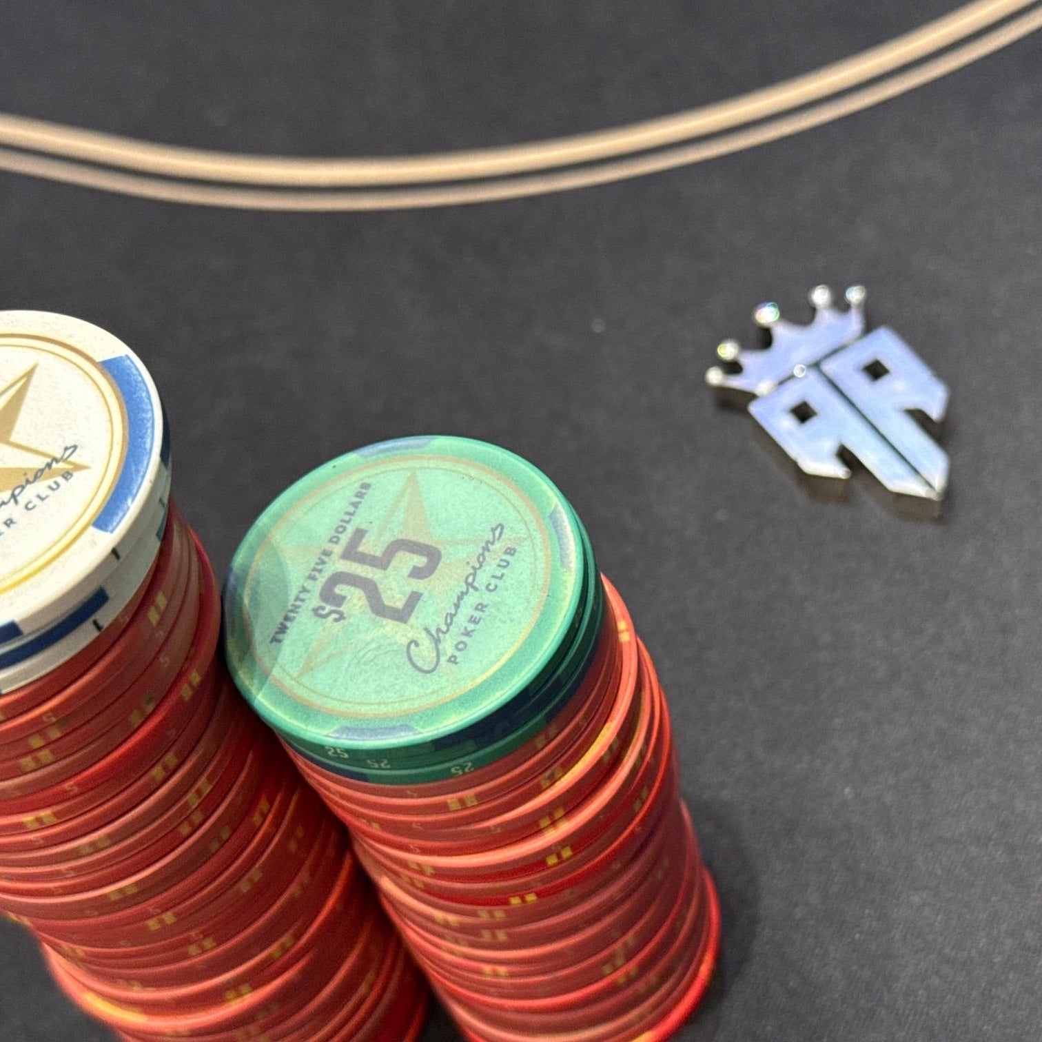 These were made for RunnerRunner Poker Club in Houston. They requested cubic zirconium at the crown points and enameled black accents